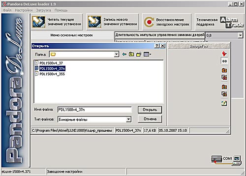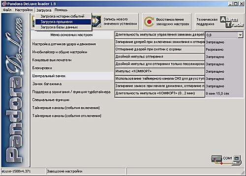 Для смены прошивки необходим USB-модуль RMP-01, программа Pandora Loader v1.9 и прошивка, которую можно скачать отсюда http://alarmtrade.ru/service/docs Смена ПО производится следующим образом: 1. установить Pandora Loader v1.9 с драйверами. 2. подключить модуль программирования RMP-01 и к базовому блоку сигнализации, вместо RF-модуля 3. запустить программу 4. набрать ПИН-код 5. убедиться в наличии связи между базой и компьютером (см. нижний правый угол "статус подключения", в нижнем левом отображается текущая версия прошивки) 6. выбрать п. меню "загрузка" подпункт прошивка Более подробная информация содержится в Help-файле программы. Производитель не несёт ответственности в случае выхода из строя или порчи изделия в ходе изменения программного обеспечения. Все действия Вы делаете на свой страх и риск!