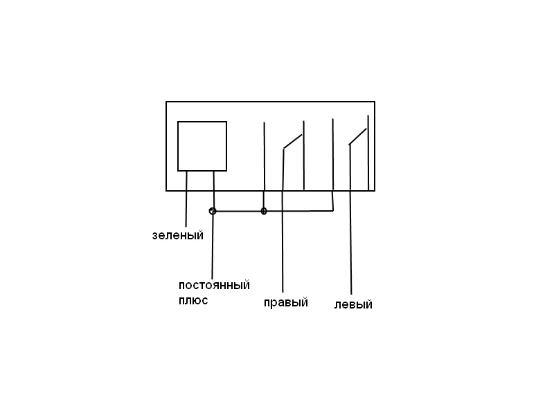 Подать постоянный плюс на один контакт катушки и пару контаков групп, к оставшимся контактам групп подключить провода поворотников, ко второму контакту катушки подключить зеленый провод.