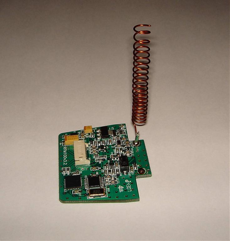 Провёл большую серию замеров напряжённости поля создаваемой штатной антенной а также серию опытов по определению точности её настройки. В результате исследования было определено, что штатная стальная спиральная антенна настроенна правильно, также учтено влияния пластмассового корпуса RF модуля на частоту резонанса антенны. То есть, диаметр намотки и количество витков спирали выбрано с учётом вносимых влияний диэлектрической проницаемости пластика корпуса модуля. Это значит, что если открыть корпус радиомодуля, то настройка антенны сбивается и частота резонанса уходит вверх по частоте. При этом отдача антенны падает как минимум в два раза. Надо отметить также что в настройке антенны учтено и влияние лобового стекла, резонанс спирали в закрытом корпусе лежит чуточку выше от рабочей частоты, но когда модуль приклеивается на стекло частота резонанса становится точно в рабочие граници частот. Для того чтобы получить максимальную отдачу на столе пришлось намотать два витка изоленты прямо на спираль внутри корпуса, имитируя влияние слекла.