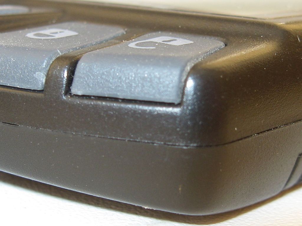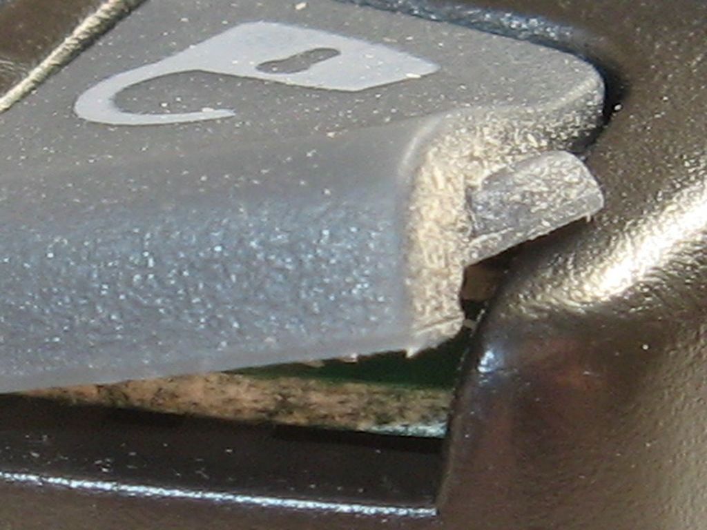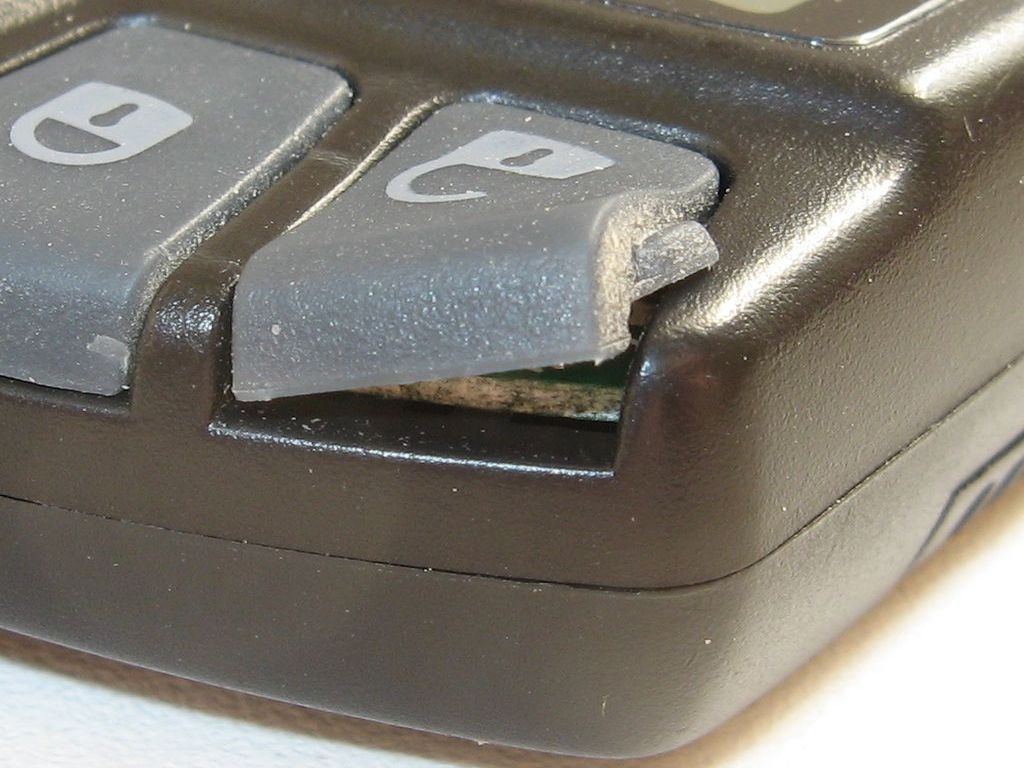 Вот, снял кнопку 2 на брелоке от 2500 Пандоры. Как видно, кнопка ОЧЕНЬ легко снимается с посадочного места. Кроме того, элемент, дОлжный удерживать ее на месте слишком мал для этого, поэтому резинка легко отходит.