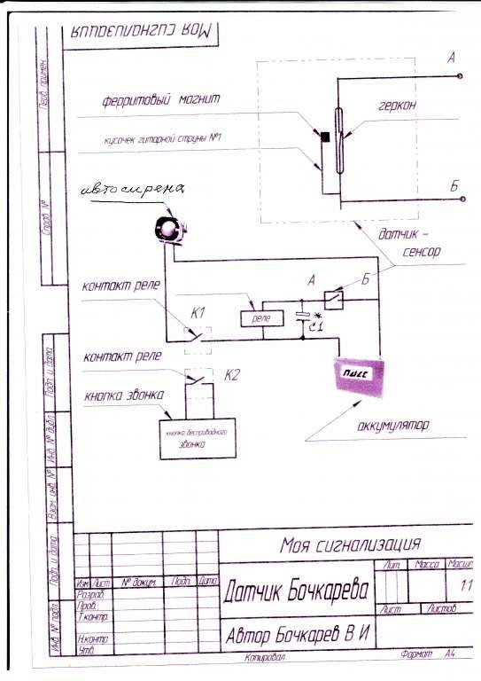 За несколько минут можно собрать сигнализацию для любого объекта, даже велосипеда из дистанционного музыкального звонка, желательно с двумя приемными устройствами, геркона и магнита на пружине. Все продается в магазинах. Пружина любая, подходящей необходимой гибкости. Можно применить и витую и плоскую и кусочек струны. Магнит с герконом скрепляете винтиками кусочком толстой проволоки (медь, нихром, алюминий), легко отрегулировать расстояние и чувствительность срабатывания на вибрацию. Два гибких провода от геркона припаиваете внутрь кнопки звонка, просверлив в крышке отверстие для проводов, к микрокнопке по диагонали. Датчик с кнопкой нужно располагать на расстоянии не менее 40-50 см иначе близко не работает. Один приемник отпугивает музыкой, другой у вас в кармане или в комнате, где вы располагаетесь. Если нужна мощная сирена, к динамикам припаивают реле или геркон включает напрямую. Подробно на