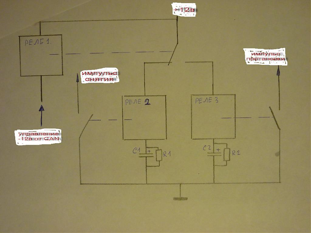 Я понял так: режим охраны - отрицательный потенциал (минус 12в), снято с охраны - никакого потенциала нет (не плюса, не минуса). Тогда я бы предложил схему на трех реле. Одно реле, с переключающим контактом, управляется с кан модуля. Переключающий контакт подает 12в на один из двух выходов реле. На какой зависит от состояния охраны. А уже к этим двум выходам подключить по схеме формирования импульса ( 1-2 сек ) на реле, конденсаторе и резисторе. Эти импульсы и подать на входы сигналки - снятие и постановка. Подобные формирователи импульса я использовал неоднократно, нареканий нет. Конденсаторы примерно по 1000-3000 мкФ, резисторы 1-3 кОм ( зависит от типа реле ). Схема во вложении. Недостаток схемы в том, что в режиме охраны реле1 потребляет ток ( реле 2 и 3 при работе почти ничего не потребляют ) . Хотя в посте 771 указано, что такое реле уже решили применить. Поэтому, в качестве реле1 я бы взял что нибудь малогабаритное, что бы в режиме охраны не было большого потребления.