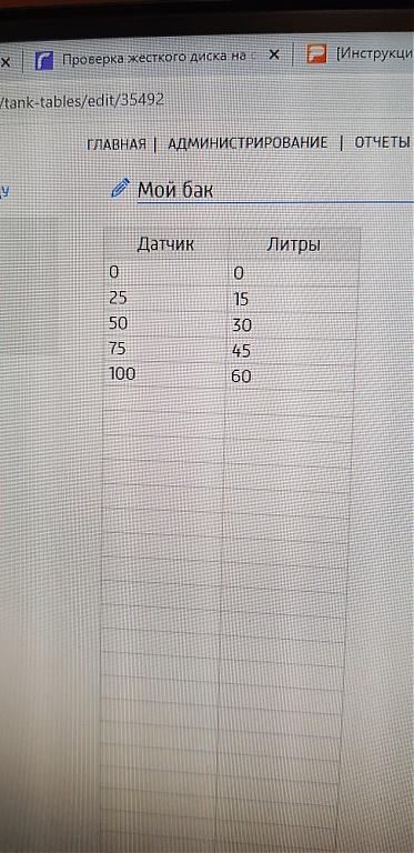 Нет, всё интуитивно понятно. Но попробую расписать для бака 60 литров: на сайте нажимаете Администрирование-Тарировочные таблицы-Добавить таблицу, вводите два показания 0-0, 100-60, нажать Сохранить справа вверху. Потом нажимаете Главная-Настройки-Топливо-Объем бака 60 л-Добавить бак-Раскрыть датчики-Источник (Can/Аналог)-Таблица (new table), не забыть после этого нажать Сохранить.