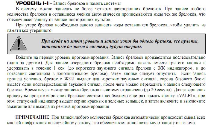 Находишь кнопку Валет, вводишь пин код (заводской 1,1,1,1). Жмешь 1 раз валет, видишь 1 мигание красного диода, слышишь 1 пип. Жмешь и держишь до первого тряма все три кнопки на пейджере, слышишь ПИП в ответ от машины, жмешь и держишь до погасания красного диода на одностороннем пульте (около 7 сек) все три кнопки, слышишь в ответ ПИП от машины. Давишь валет, видишь серию вспышек красный/зеленый, включаешь/выключаешь зажигание. Все. http://www.alarmforum.ru/attachment....1&d=1231765610 было пару раз. В основном из-за галимых батареек, напруга просаживается, происходит косячок из-за недопереданных/недополученных данных, вот и результат.