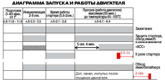 Суть проблемы в следующем. По завершении автозапуска сигнал на проводе обхода иммобилайзера отключается, а затем проходит импульс на глушение двигателя (стартерный провод). Поэтому двигатель не глохнет, т. к. чип иммобилайзера уже отключен от считывающего устройства автомобиля. Необходимо, чтобы сначала проходил импульс на глушение двигателя (стартерный провод), затем пауза 0.5-1 сек. и отключение сигнала на проводе обхода иммобилайзера. После того как двигатель заглушен в автомобиле остаются включенными АСС ( отопитель, подогрев сидений, магнитола) и автосвет. Поэтому, после выключения зажигания и обхода иммобилайзера, с паузой в 2 сек. необходимо подать ещё один импульс на кнопку «старт» для выключения АСС. Для этих целей очень хорошо подошёл бы импульс на закрывание ЦЗ после глушения двигателя, но он должен быть на отдельном проводе и пауза должна быть 2 сек. а не 1сек. как это сделано сейчас. В прилагаемом рисунке необходимые доработки показаны красным цветом. Вложение 385 |