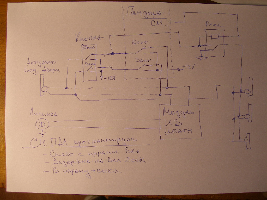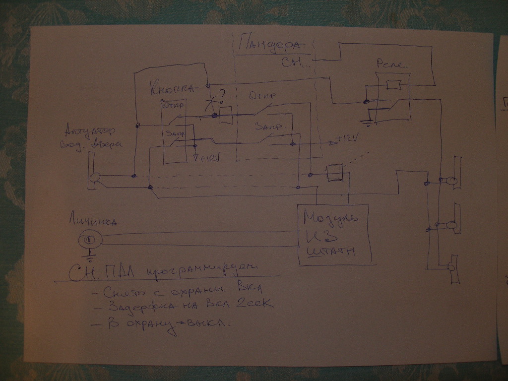 ... ну и еще один нюанс. Если авто под охраной Пандоры, а я снимаю штатнусю сигу, то замки откроются, а нужно, чтобы не открылись. И наоборот. Если стоит под охраной штаной, а я снимаю Пандору, то замки тоже открыться не должны.