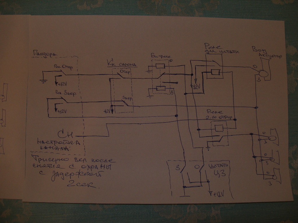 в первой схеме была ошибочка... как раз с кнопулькой на которую ты писал ...., отчасти ты был прав (пивас подействовал) вот Вложение 388 С БУ ты чет путаешь... в лачете в каждой двери обычные актуаторы стоят.. никаких там контакторов...... провода от всех 4 шт. собраны в кучу и идут на блок ЦЗ между сиденьками (вроде так) эт блок и формирует сигнал ЦЗ... и принимает радио от брелока и от личинки водителя два провода идут. Вот моя схема без диодов и т.п. Сделана по силе поэтому бистабильное реле нуно мощьное (даж ненаю есть такие или нет) если не найдешь скажу как усилить слабое бистабильное мощьным реле. Вложение 387 Нюанс ток один вроде.... Снимешь пандору, штатным ключом вод. дверь моно открыть только через 2 секунды |